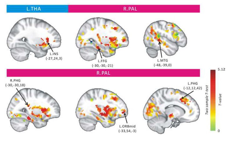 图4. 皮下脑区-大脑皮层的功能连接的两组比较结果