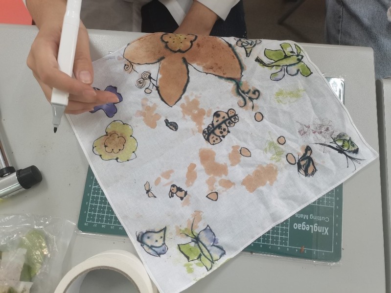 随着敲击声逐渐平息,色彩丰富的植物图案跃然纸上,大家根据自然形成的图案用颜料再进行二次创作,创造出了独一无二的拓印作品。