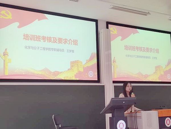 随后,化学与分子工程学院专职辅导员王梦雅老师向大家介绍了本次培训班的学习要求、考核要求、学习任务和纪律要求,要求大家认真完成学习任务,严格遵守班级管理规定,学有所思,学有所成。