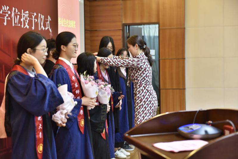 在隆重的学位授予仪式上,院学位分委员会、MAP学位评定小组成员代表为在场的毕业生拨穗。