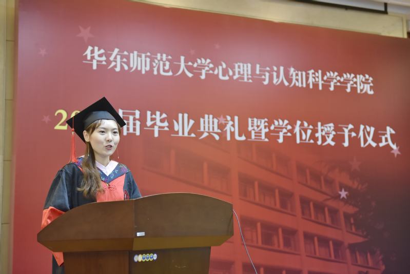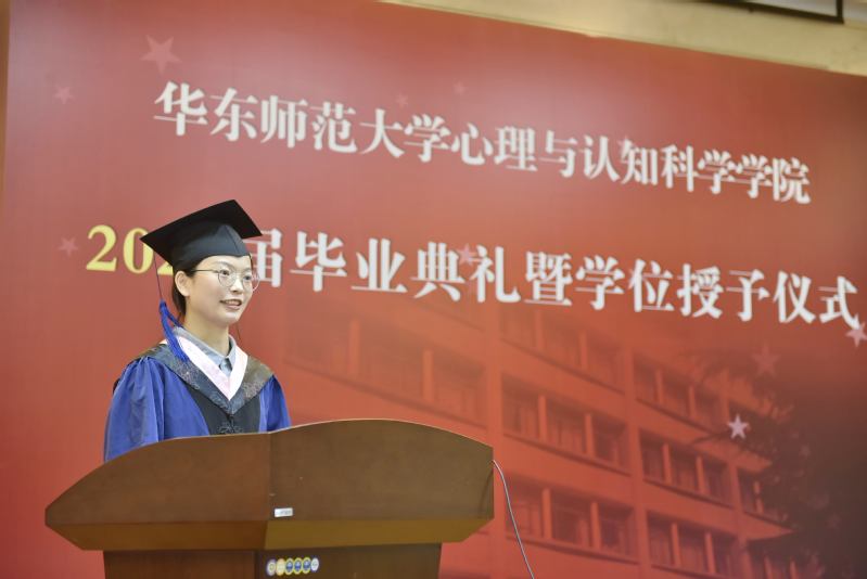 博士生代表、本硕博均就读于我院的齐芳珠谈到,十一年的学习时光,华东师大见证了自己的改变与坚守,她认为师大赠予了学子们温柔与力量,希望心理学子们能将这份温柔与力量传递下去,无论未来是否从事科研工作,都能不忘初心,求实创造;无论未来是否为人师表,都能俯仰之间,无愧于心。