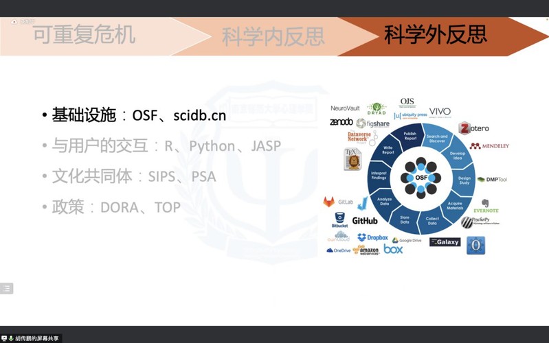 其次是科学外反思,主要是科研者与科研环境交互的问题。开放科学不仅需要优质的基础设施(OSF、scidb.cn)、与用户的交互(R、Python、JASP),还需要文化共同体(SIPS、PSA、COSN)、一些奖赏的政策(DORA、TOP),以及一些强制性政策让大家不得不去做。