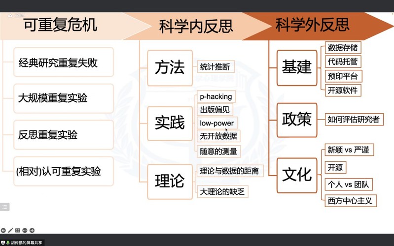 在介绍完可重复性危机的背景后,胡传鹏教授提出了反思。首先是科学内反思,主要是通过规范研究者行为来变革。在方法方面,研究者应当革新统计推断方法,重视效应量估计和不确定性估计,采用贝叶斯统计、层级模型等代替传统的t text和ANOVA。在实践方面,研究者和期刊不要过度追求显著结果。当发现假设不显著时,研究者不能修改假设以伪装得到阳性结果,因为如果把探索性的结果当作研究性的结果,可能无法得到重复。同时,研究应避免过小的样本量,研究者应当主动共享开放数据,采用pre-registration保证研究过程公开透明,并对测量的效度进行探究以避免随意测量。在理论方面,研究者应加大对大理论的挖掘与总结,以加强理论与数据之间逻辑链条的严谨性与紧密性。