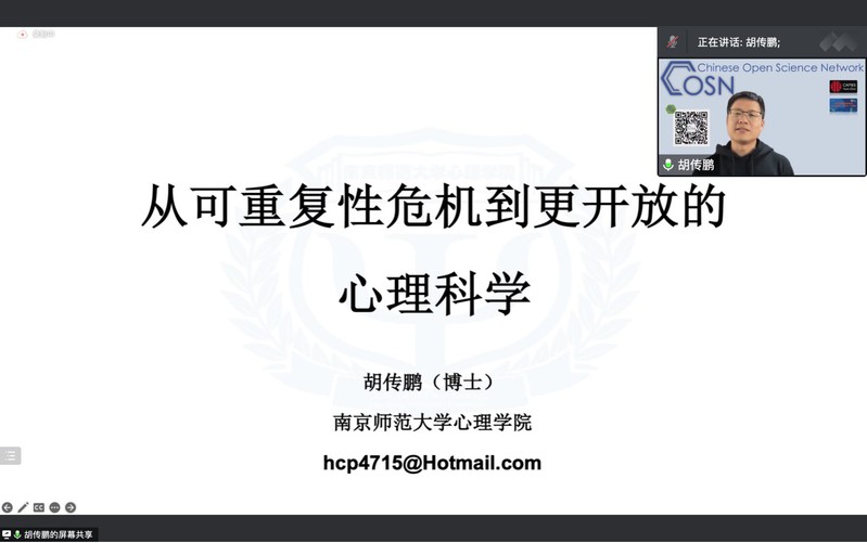 主讲人简介:胡传鹏教授在2017年于清华大学心理学系获得博士学位,2017年~2020年在德国莱布尼兹心理韧性研究所进行博士后研究,2022年12月至今就职于南京师范大学心理学院。他的研究兴趣主要包括自我的认知过程、社会经济地位与脑、研究的可重复性与元研究,曾以第一/通讯作者在Science Bulletin、Neuroscience & Biobehavioral Reviews、科学通报等期刊发表中英论文22篇,担任学术期刊Advances in Methods and Practices in Psychological Science (影响因子 15.8)等的编委,并联合创办了欧洲地区的华人心理与脑科学学会(Chinese Association for Psychological & Brain Science)。基于开放科学的理念,他发起并主编了OpenScience学术公众号。同时,他也参与了多项关于可重复性问题的大型国际合作项目,目前在心理科学加速器这个全球的科学心理学研究者合作网络中担任Assistant Director,也是Center for Open Science在中国大陆的第一位推广大使。近期,胡教授加入了Nature旗下Communications Psychology期刊的编委会。