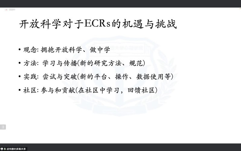 随后,胡传鹏教授介绍了开放科学对于青年科研工作者的机遇与挑战。在观念上,青年科研工作者应当以更加透明公开的研究流程拥抱数字化时代,在做的过程中学习;在方法上,青年科研工作者可以不断学习与传播新的研究方法和规范;在实践上,青年科研工作者能使用限制更少的开源软件,甚至得益于现成的公开数据包,青年科研工作者能够在不收集被试数据的情况下得到实验结果的初步预估;在社区中,青年科研工作者在不断汲取知识的同时也应当回馈社区,为科学的发展贡献力量。