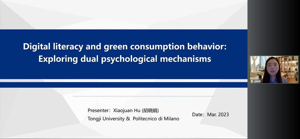 同济大学和意大利米兰理工大学联合培养的胡晓娟,作了题为“Digital literacy and green consumption behavior: Exploring dual psychological mechanisms”的报告。胡晓娟认为,由于突出的环境问题,绿色消费蓬勃发展。研究基于社会认知理论和自我调节理论,考察了消费者数字素养与绿色消费行为之间的关系,并探讨了两种不同的机制。基于认知的机制包括自我效能和结果期望;基于情感的机制包括预期自豪和预期内疚。此外,该研究还探索了绿色产品可得性如何调节四个中介因素与绿色消费行为之间的关系。研究结果表明,消费者的数字素养通过自我效能、结果期望、预期自豪和预期内疚来影响绿色消费行为。此外,绿色产品可得性增强了自我效能和预期自豪对绿色消费行为的影响。