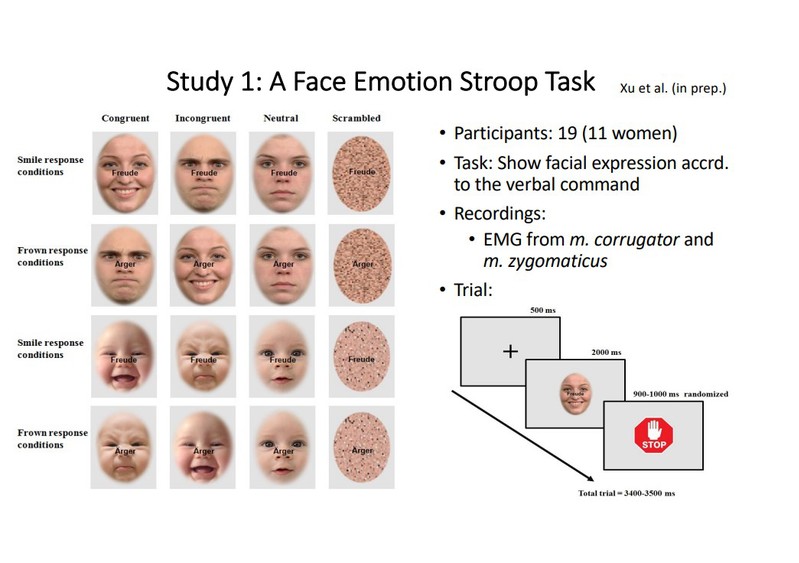 接下来,Sommer教授介绍了课题组近期构建的面部情绪Stroop任务。该任务可用于测量社会情境下执行控制的抑制成分。在新范式中,被试需要根据信息一致或不一致的单词提示对情绪面孔完成行为任务。目前,团队已使用该范式完成了三项研究。研究的目标人群包含为人母与未为人母的女性,以及有着不同童年经历和不同程度暴力行为的成人和青少年。该系列研究结果显示,面部情绪Stroop任务相对于传统的色彩Stroop任务对社会因素测量更具敏感性。