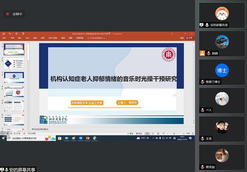 华东师范大学社会发展学院安秋玲副教授作了题目为“机构认知症老年人抑郁情绪的音乐时光操干预研究”的报告。安秋玲副教授团队发现,认知症老人的抑郁情绪问题普遍存在但尚未被重视,经研究分析表明,对于认知症的非药物干预是有效的。因此其团队整合了多种干预手段,包括认知干预、感官刺激、运动干预等,聚焦认知症长者心理健康,通过创新非药物治疗整合方式,打造了专属本土的文化疗愈方式。为改善认知症长者的情绪问题提供了新方法。