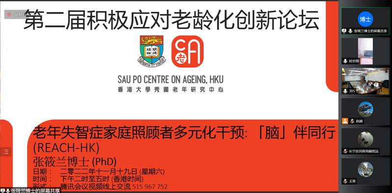 香港大学秀圃老年研究中心张筱兰研究员长期从事健康预期寿命、死亡压缩模型、人口高龄化、健康长寿、百岁老年人、成功老龄化及失智症照顾的研究和教学工作。她本次报告题目为“年失智症家庭照顾者多元化干预 –「脑」伴同行”。张筱兰研究员关注失智症家庭中照顾者的心理健康,她们实行的伴「脑」同行计划提供多元化、结构化、个性化、非药物治疗以及本土化的辅导服务,对于照顾者,抑郁症状及负担有明显减少,而照顾者中的获益有显著增加,整体的健康及睡眠质量都有显著改善,可以明显加强优质照顾并减少攻击性行为。