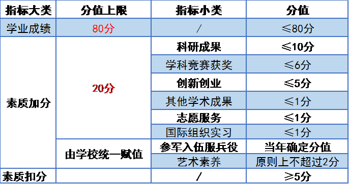 评分原则:素质加分应能反映出一名优秀本科生所应具备的品质,即专业能力与科研素养(包括创新精神、运用理论之时解决实际问题的能力)、综合能力、社会责任感以及人格品行等。