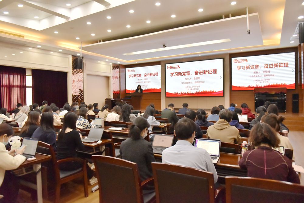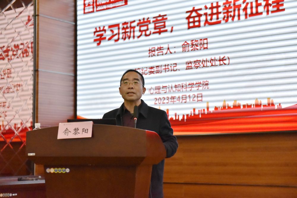 2023年4月12日下午13点, 为深入学习中国共产党章程,进一步推进学习贯彻党的二十大精神走深走实,华东师范大学心理与认知科学学院党委邀请校纪委副书记、监察处处长俞黎阳作《学习新党章,奋进新征程》专题辅导报告。学院教工党员、学生党支部支委、学生入党积极分子参加现场学习,报告会由学院党委书记方媛主持。