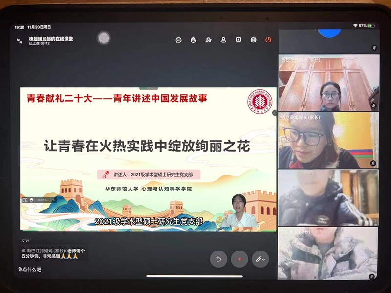 2021级学硕党支部以《让青春在火热实践中绽放绚丽之花》为题,邀请三位学生党员分享了2022年上海疫情期间在校园内进行志愿服务的经历与感受,呼吁同学们以执着的信念、优良的品德、丰富的知识、过硬的本领,担负起历史的重任,让青春在火热实践中绽放绚丽之花,让鲜红的党旗始终高高飘扬。