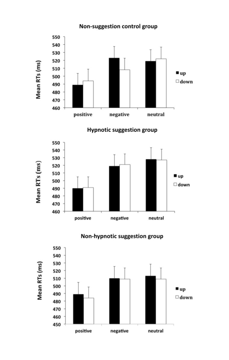 具体来说,既然情绪词的识别速度受到向上或向下箭头(空间信息)的影响,如果使用催眠暗示或非催眠暗示,让高催眠感受性的被试忽略这些箭头带来的空间信息,那么这种相对稳定的自动化认知反应是否还存在呢?