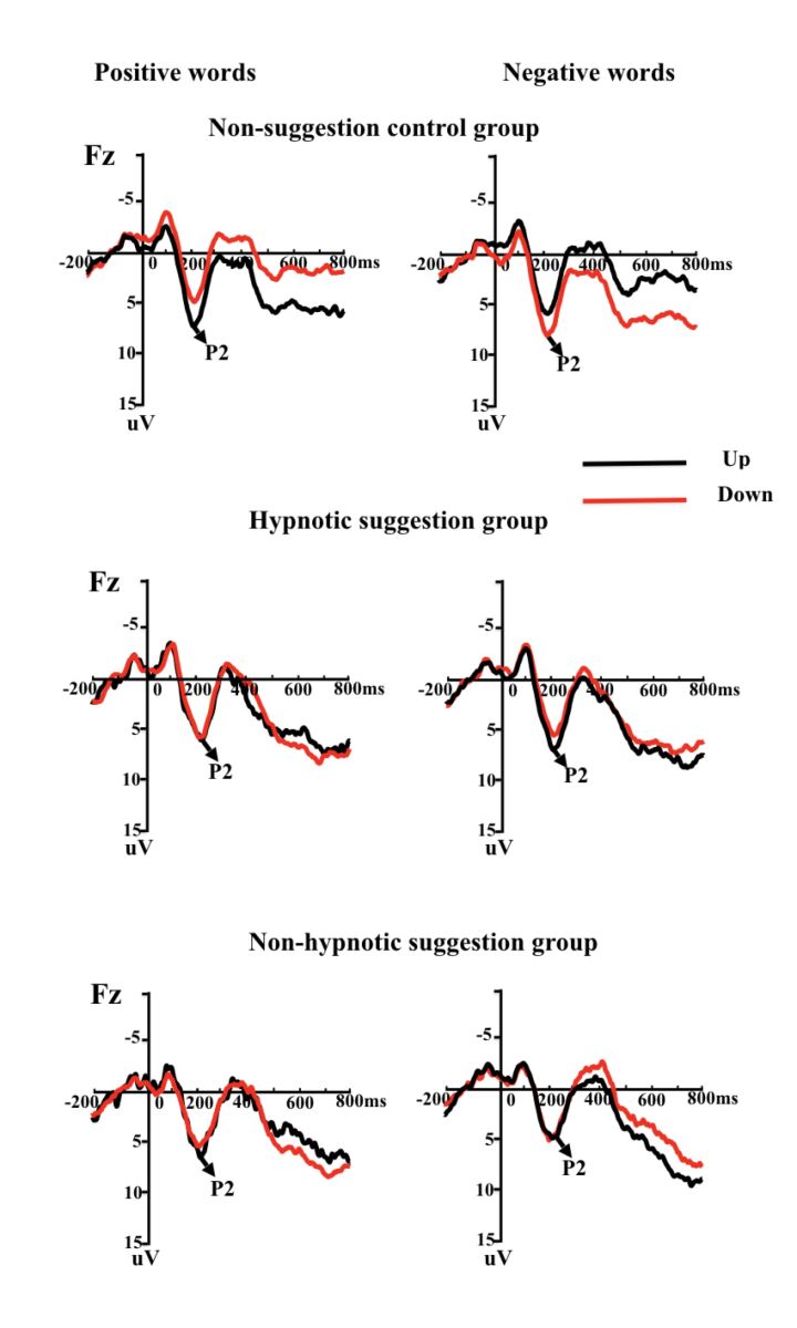 脑电实验的结果同样发现,在控制组,和早期注意相关的P2成分在空间信息和情绪效价信息一致时比不一致时更大,但是这种P2增大的效应在催眠暗示组和非催眠暗示组都消失了(如下图),由此提示了这两个组的高感受性被试可能是在暗示的作用下根本没有注意到箭头(空间信息)。