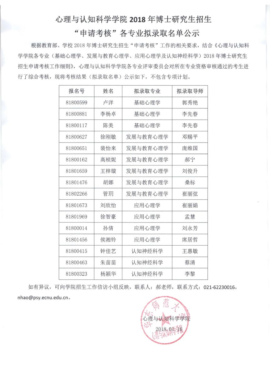2018年博士研究生招生各专业拟录取名单公示