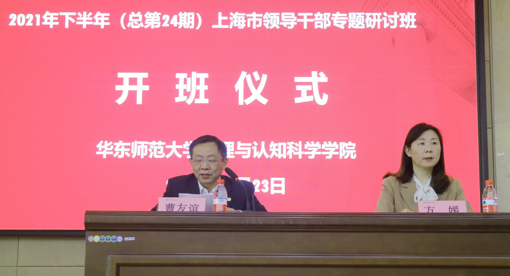 10月23日,由华东师大心理与认知科学学院承办的第24期上海市领导干部专题研讨班,在华东师大普陀校区俊秀楼223小剧场正式开班。来自上海市各大委办的47名厅局级干部参加了本期学习,华东师范大学党委副书记曹友谊出席开班仪式。开班仪式由心理与认知科学学院党委书记方媛主持。