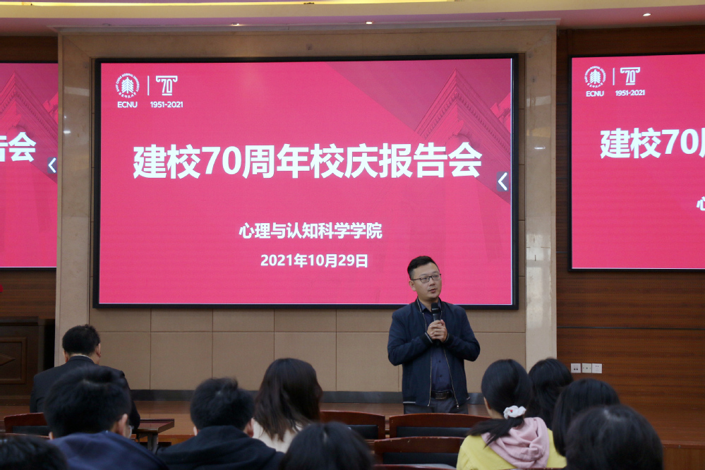 2021年10月29日,在普陀校区俊秀楼223学术报告厅,心理与认知科学学院举办“建校70周年校庆学术报告会”。心理与认知科学学院名誉院长周晓林,副院长郝宁,紫江青年学者高晓雪、尹大志,副教授黄楚中、陈中廷、胡杨、王一集,明园晨晖学者梁一鸣、周晗昱等老师出席,100余位师生参加了报告会。报告会由陈中廷、尹大志主持。