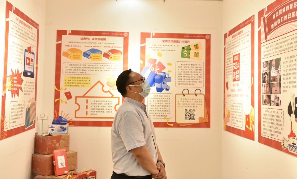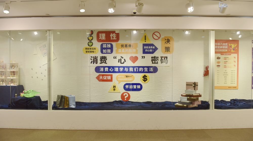 为深入学习贯彻习近平新时代中国特色社会主义思想,把主题教育学习和调研落实到完成党的二十大关于教育的重大战略部署中去,发挥学科优势,为身边师生办实事好事,5月31日,心理与认知科学学院策划的“消费‘心’密码”主题科普展在普陀校区图书馆二楼展厅正式拉开帷幕。本次展览共分为四大板块:常见的营销策略、洞悉消费者的心理、社会关系中的消费者、识别并善用决策偏差。展览将鲜活生动的生活案例搬进展厅,从消费心理学的视角探究“怎样才能理性、快乐地消费?”