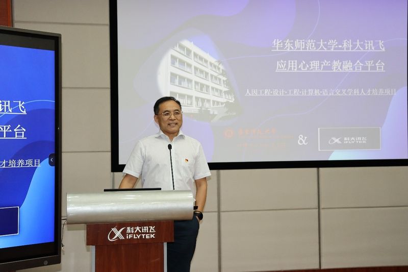 科大讯飞研究院副院长李鑫在致辞中,对华东师范大学心理与认知科学学院一行的莅临表示欢迎。他表示,华东师范大学是教育领域的排头兵,教育也是讯飞最核心的业务,双方围绕教育开展交流合作有很好的基础。李鑫指出专业实践基地将具备“人”(教师、学生)“学科”“地域”(长三角一体化)三个纽带的功能,期待通过专业实践基地的建立,进一步加深、加厚双方的合作基础。