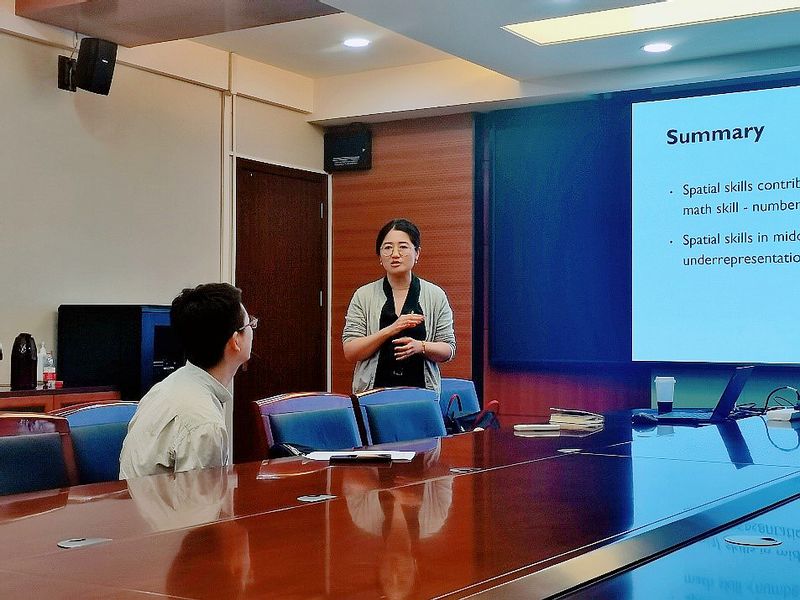 随后,田晶教授介绍了自己的第二项研究工作,数学水平的性别差异。研究发现,空间技能——对空间关系进行心理操作和推理的能力,是导致数学水平性别差异的重要因素。具体表现为,早期空间技能的性别差异在短期导致了特定数学学业表现的性别差异,在长期将引起大学STEM专业选择的性别差异。