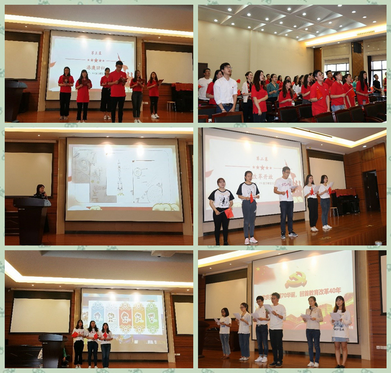 接着,学生党员们通过情景剧表演、诗歌朗诵、故事分享、绘画、咏唱等鲜活的形式回顾了开国大典、改革开放、港澳回归、世博会、进博会、教育改革发展、航天事业发展七个具有代表性的重大历史成就,表达了对新时代、新征程的期待和展望。